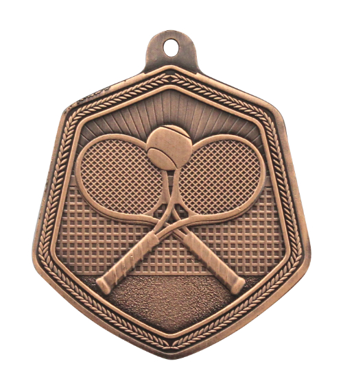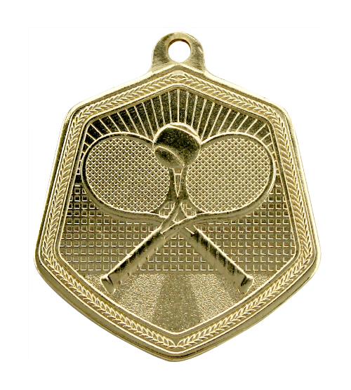 Tennis hexagonal medals available in Gold, Silver and Bronze.