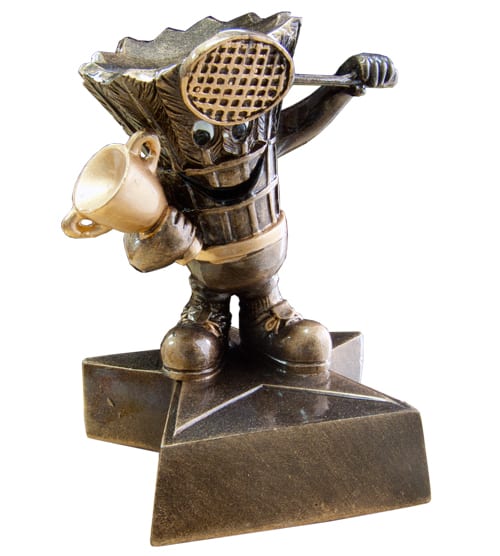 Bronze Mini Badminton figure on a star base, molded from resin as one unit.