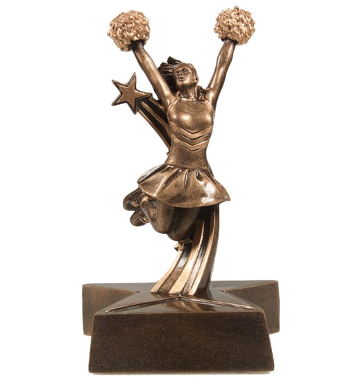 Bronze Cheerleader figure on a star base, molded from resin as one unit.