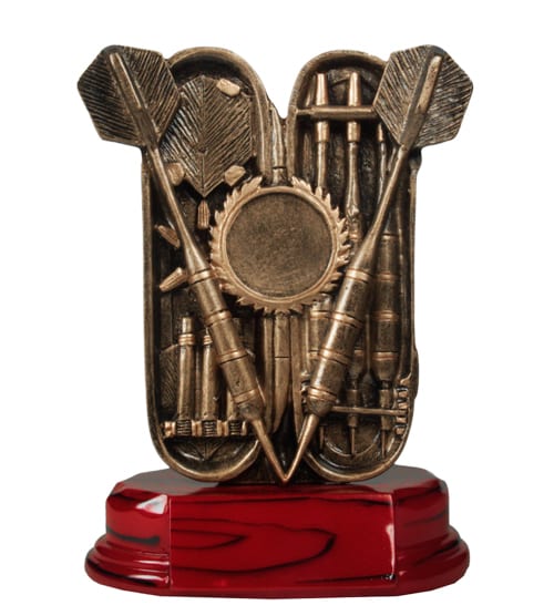 Bronze dart case trophy on gloss wood finish base, molded from resin as one unit.