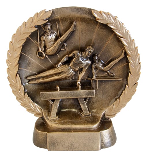 Bronze award with male gymnasts, molded from resin as one unit.