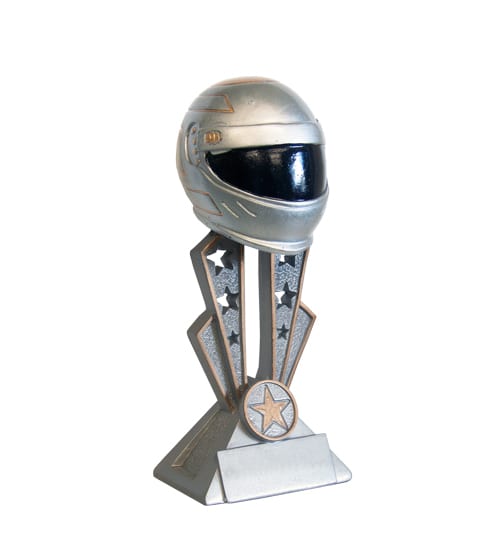 Silver motorsport helmet set on top of two decorative columns, molded from resin as one unit.