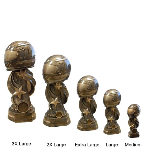 Bronze helmet on top of a circular column and base, molded from resin as one unit.